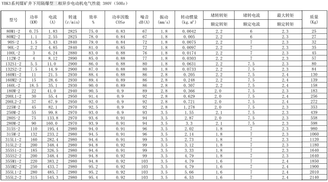YBK3系列隔爆型三相異步電動機(jī)是為煤礦井下采掘工作面機(jī)械設(shè)計的專用電動機(jī),機(jī)座由鋼板焊接成形,風(fēng)罩、接線盒、絕緣結(jié)構(gòu)采取加強(qiáng)措施,電氣性能、安裝尺寸、額定功率等均與YB2電動機(jī)相同。 本系列電動機(jī)的防爆性能符合GB3836.1-2010《爆炸性環(huán)境 第1部分:通用要求》和 GB3836.2-2010 《爆炸性環(huán)境 第2部分:由隔爆外殼"d"保護(hù)的設(shè)備 》標(biāo)準(zhǔn)的規(guī)定,制成隔爆型ExdⅠ Mb, 適用于煤礦井下采掘工作面。